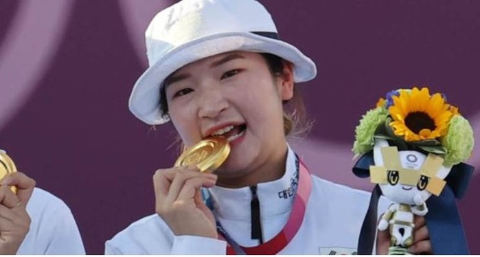 25일 도쿄올림픽 양궁 여자 단체전에서 강채영이 사진 촬영을 위해 마스크를 벗고 금메달을 깨물고 있다. 사진=연합뉴스