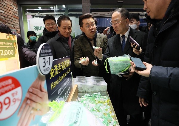 ▲ 홍남기 경제부총리 겸 기획재정부장관이 화장품 점을 들러 마스크와 손 소독제를 살펴보고 있다. <사진 : 연합뉴스> |