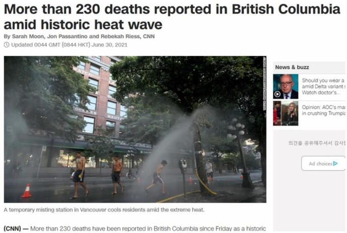 기록적인 폭염이 원인으로 의심되는 인명피해가 속출하고 있다. 이 달 25~28일 나흘간 233명이 사망했다고 CNN이 전했다. 캐나다 연방경찰은 “아직 조사가 진행 중이지만 대다수의 사망 원인에는 더위가 일조한 것으로 추정하고 있다”고 전했다.