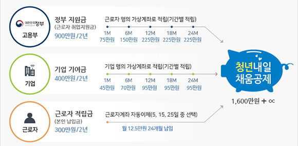 지원대상은 중소·중견기업에 정규직으로 취업한 청년과 이들을 채용한 기업 모두에 해당하는데, 신규취업한 청년이 일정금액을 납입하면 정부와 기업이 일정 금액을 보태 만기 시 일시금을 받는 일종의 3자 공동적금이다.