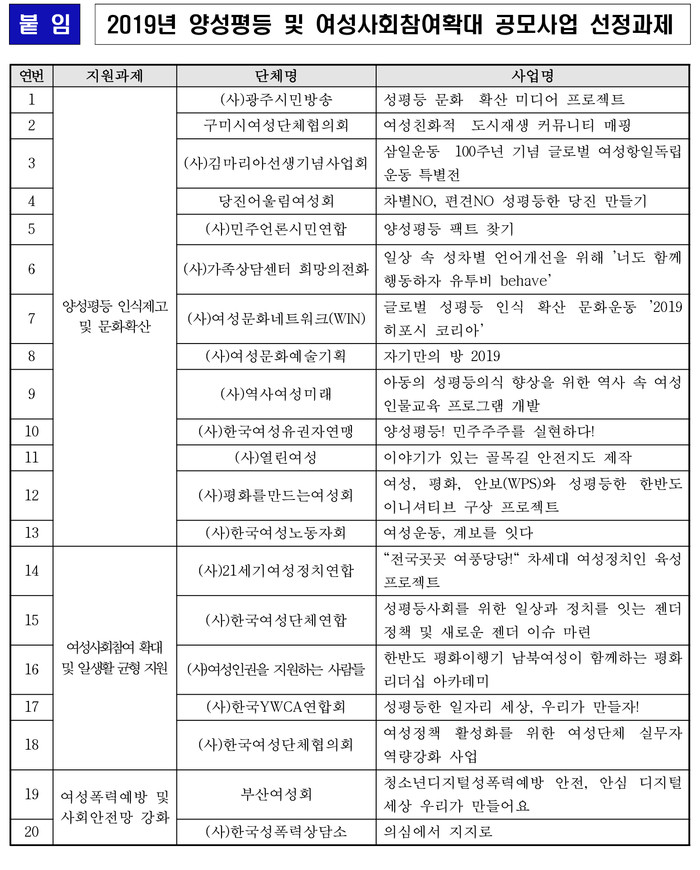 | ▲2019년 양성평등 및 여성사회참여확대 공모사업 선정과제 |