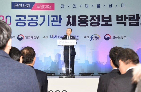홍남기 부총리 겸 기획재정부 장관은 8일 서울 양재동 aT센터에서 열린 ‘2020 공공기관 채용정보박람회’에 참석해 “지난해 2만3284명보다 2369명 증가한 2만5654명을 신규 채용해 구직자들에게 더 많은 취업 기회를 제공하겠다”고 밝혔다.