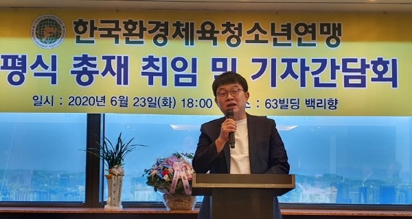 | ▲ 한국환경체육청소년연맹 2대 총재에 취임한 김평식 신임 총재가 인사말을 하고 있다. 2020.6.23. (사진=오지산 기자) |