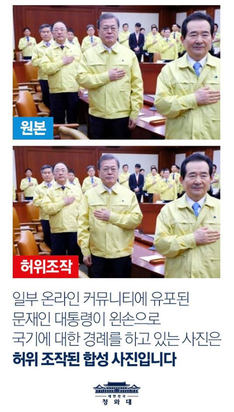 청와대는 5일 트위터와 페이스북 등을 통해 “일부 온라인 커뮤니티에 유포된 문재인 대통령이 왼손으로 국기에 대한 경례를 하고 있는 사진은 허위조작된 합성 사진”이라고 전했다.