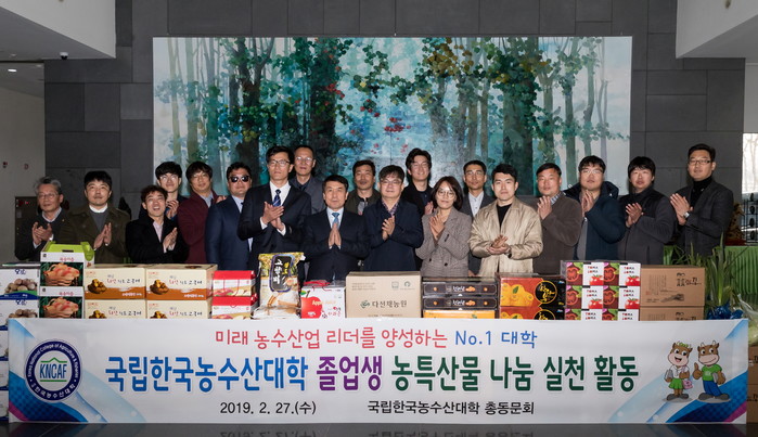 이날 한농대는 졸업생이 생산한 쌀과 각종 채소와 과일, 가공품 등 17종(쌀, 사과즙, 콩나물, 한라봉, 김, 고구마, 생보리, 천혜향, 양배추, 월동무, 표고버섯가루, 대파, 비트즙, 뽕잎 차, 떡, 누애 환)의 농산물과 졸업생들이 자발적으로 모금한 성금 등 800만원 상당의 위문품과 위문금을 완주군청에 기탁했다.
