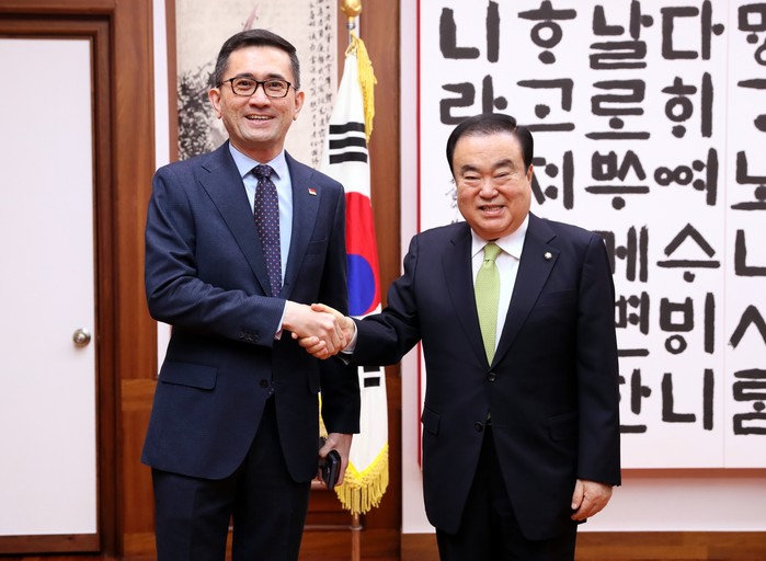 문희상 국회의장은 7일 오전 의장집무실에서 에릭 테오 신임 주한 싱가포르대사의 예방을 받았다.