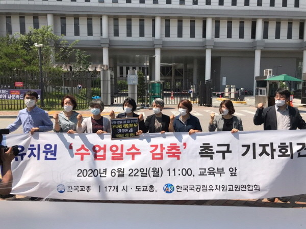 양 단체는 22일 오전 11시 정부세종청사 교육부 앞에서 공동기자회견을 열고 “지난 4월 9일부터 순차 온라인 개학을 실시한 초‧중‧고교와 달리 유치원은 어떤 대책도 제시되지 않아 학사일정이 파행에 이르렀다”며 “유치원 수업일수 감축을 위해 교육부는 유아교육법 시행령 개정에 즉각 나서야 한다”고 촉구했다.