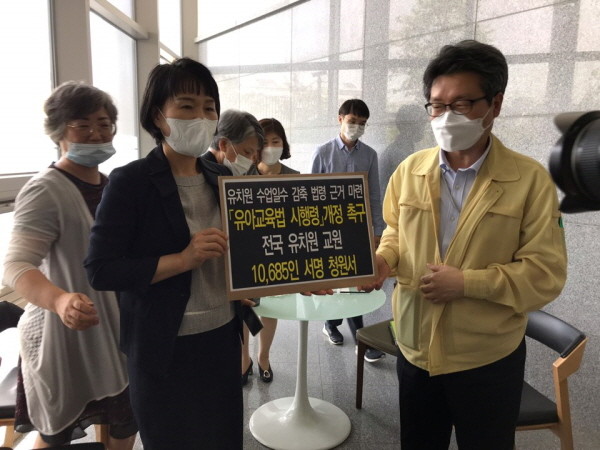 기자회견 후에는 양 단체가 6월 8일부터 18일까지 공동 진행한 전국 국공립 유치원 교원 1만 685명의 청원 서명이 포함된 유아교육법 시행령 개정 촉구 청원서를 교육부에 직접 전달했다.