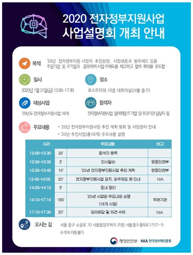 행정안전부(장관 진영)가 31일 서울 중구 포스트타워에서 ‘2020 전자정부지원사업 설명회’를 열고 올해 전자정부지원사업 추진 방향, 과제별 사업내용과 발주제도 등을 소개한다고 29일 밝혔다.