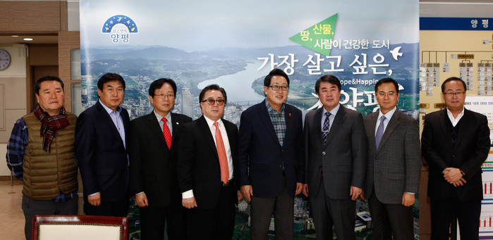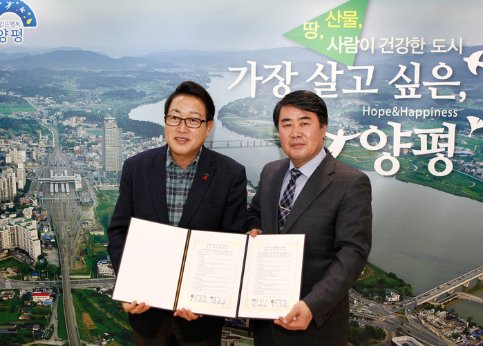 | ▲ 김선교 양평군수(사진 왼쪽)와 임현철 연맹 부연맹장(사진 오른쪽)이 업무협약서에 서명을 한 뒤 기념촬영을 하고 있 |