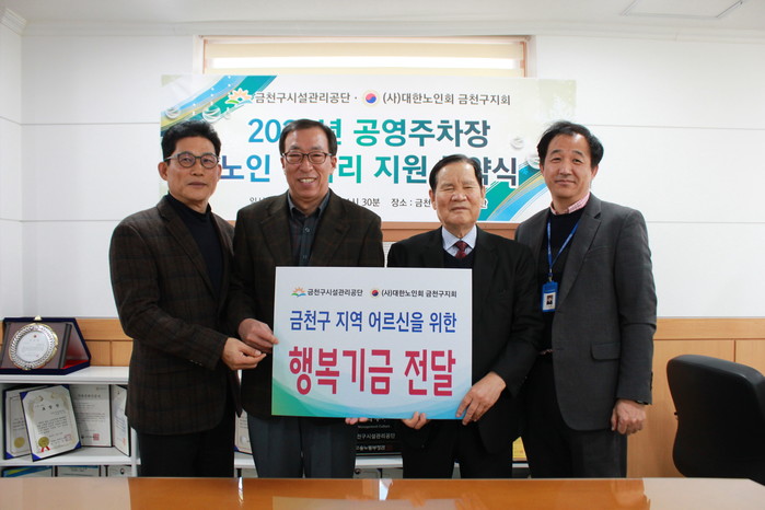 서울특별시 금천구시설관리공단(이사장 박평)은 12월 18일 대한노인회 금천구지회(회장 박세구)와 ‘2020년 공영주차장 어르신 일자리 지원 업무협약’ 체결 및 행복기금 전달식을 개최했다고 밝혔다.