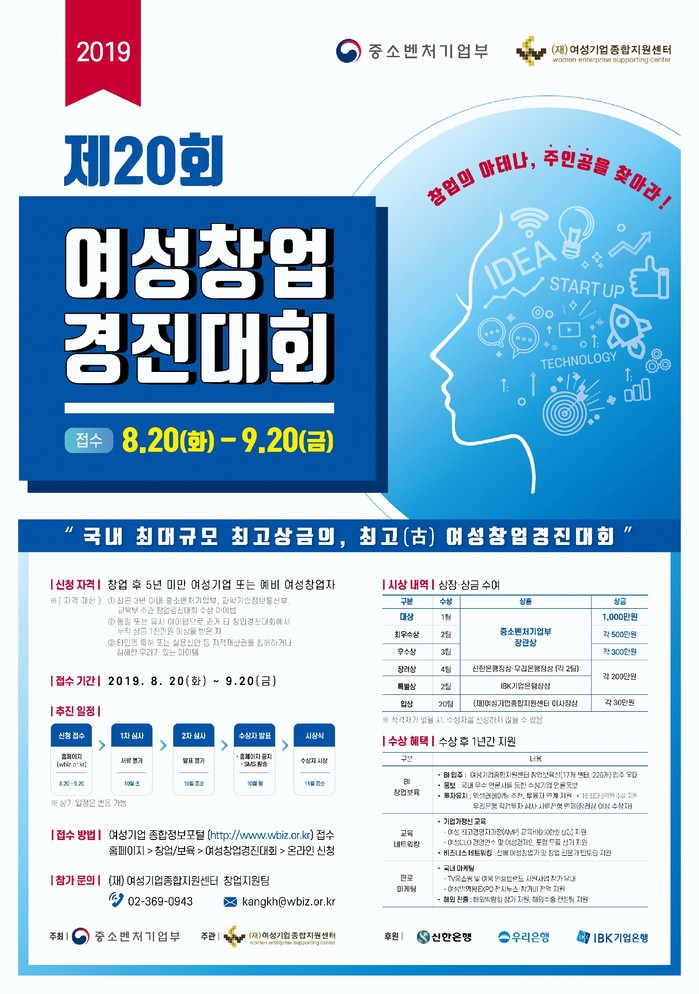 ‘여성창업경진대회’는 2000년부터 매년 개최되어 올해로 제20회를 맞이하였으며, 이번 대회는 지난해와 달리 1·2차 평가를 통해 수상인원을 32개 팀으로 늘리고(‘18, 25개 팀), 대회 상금도 총 4700만원으로 확대하여 여성창업자를 발굴·지원할 계획이다.