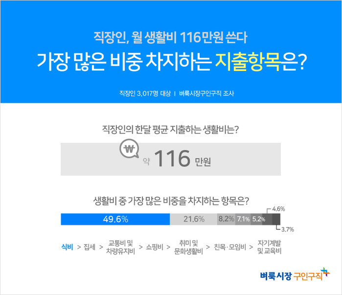 생활밀착 일자리를 제공하는 벼룩시장구인구직(대표 장영보)이 직장인 3017명을 대상으로 설문조사한 결과 직장인들은 월 평균 생활비로 116만원을 지출 하고 있었다.
