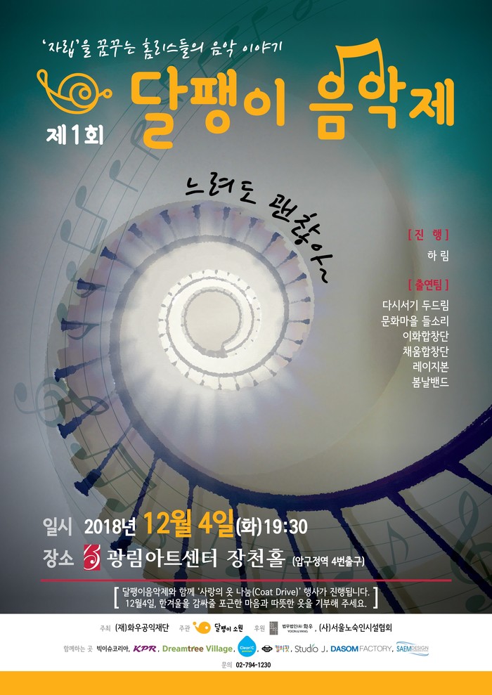 홈리스 지원 단체인 달팽이소원(대표 윤건)이 (재)화우공익재단(이사장 박영립), 법무법인 화우(대표변호사 박상훈), (사)서울노숙인시설협회(회장 최성남) 등과 함께 홈리스의 자립을 응원하는 ‘제1회 달팽이 음악제’를 12월 4일 오후 7시 30분 압구정역 5번 출구 광림아트센터 장천홀에서 진행한다고 29일 밝혔다.
