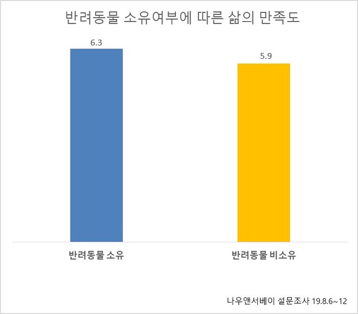 나우앤서베이가 8월 6일부터 8월 12일까지 849명(남성 444명, 여성 405명; 반려동물 소유자 459명, 반려동물 비소유자 390명)을 대상으로 반려동물 관련 설문조사를 실시한 결과, 반려동물을 키우는 응답자의 삶의 만족도(10점 만점 기준) 평균은 6.3점, 키우지 않는 응답자의 삶의 만족도 평균은 5.9점으로 반려동물 소유자의 삶의 만족도가 소유하지 않은 응답자에 비하여 더 높은 것으로 나타났다.