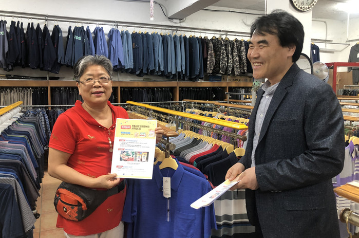 | ▲왼쪽에서 두 번째 문산자유시장 문화관광형시장 육성사업단 김종주 단장이 가격표시제 홍보 전단을 상인에게 나눠주고 있다. |