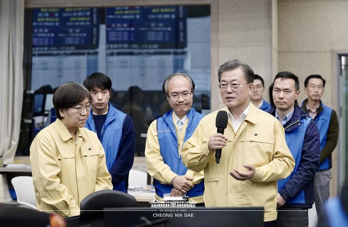 문재인 대통령이 11일 오후 충북 오송 질병관리본부에서 신종 코로나바이러스 감염증(코로나19) 대응에 총력을 다하고 있는 정은경 중앙방역대책본부장(질병관리본부장)을 비롯한 질본 직원들을 격려하고 있다.