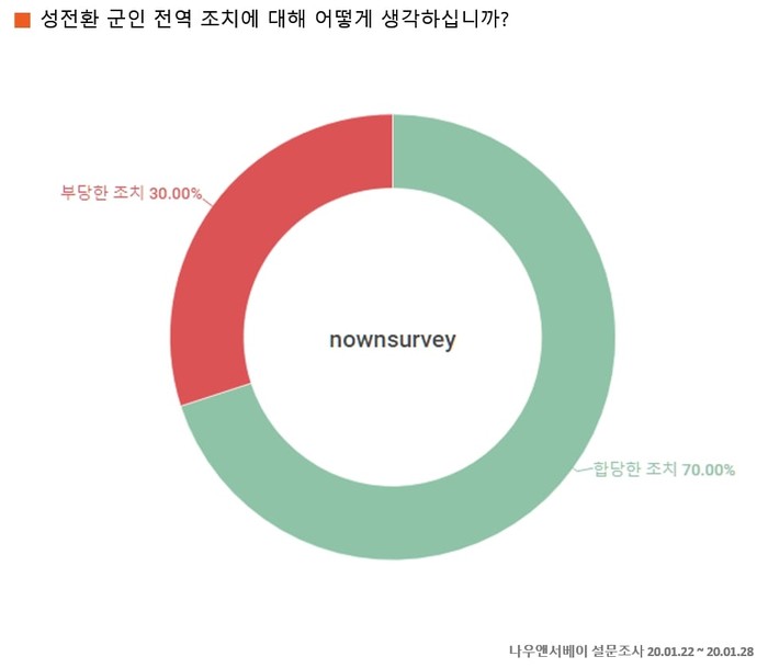 ‘성전환 군인 전역 조치에 대해 어떻게 생각하십니까?’에 대하여 질문한 결과 ‘합당한 조치(70%)’, ‘부당한 조치(30%)’로 나타났다.