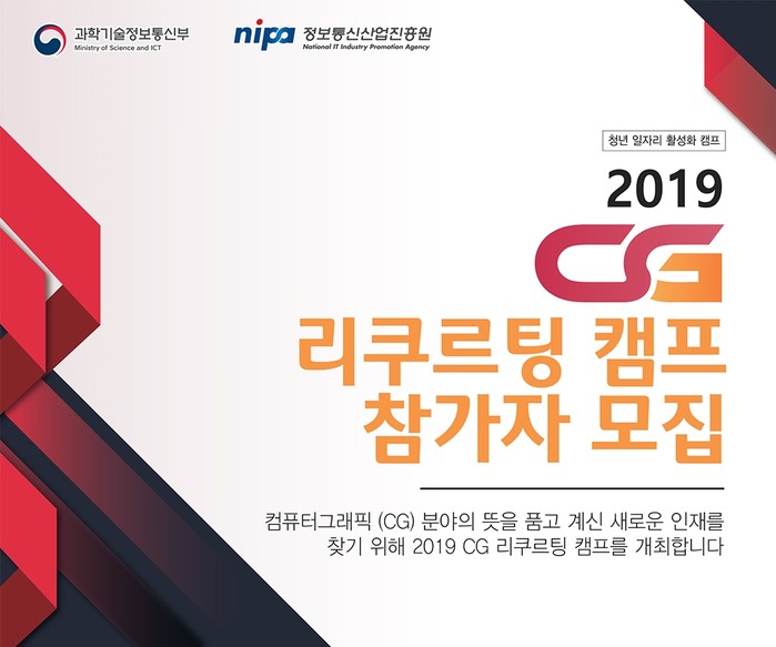 과학기술정보통신부(장관 유영민, 이하 과기정통부), 정보통신산업진흥원(원장 김창용, 이하 NIPA)은 8월 27일부터 1박 2일간 시흥 대교HRD센터에서 진행되는 ‘2019년 컴퓨터그래픽(CG) 리크루팅 캠프’ 참가자를 모집한다고 31일 밝혔다.