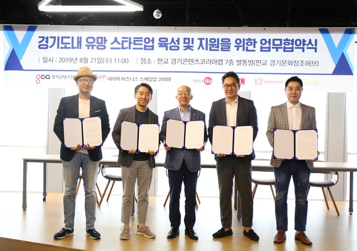 경기콘텐츠진흥원(이사장 김경표)은 도내 스타트업 발굴 및 성장 지원을 위해 네이버 비즈니스 ‘스케일업 코리아’ 주관사 ㈜인터비즈(대표 이강운) 및 공동운영사 아이티동아(대표 강덕원), ㈜인사이터스(대표 황현철), ㈜골드아크(대표 홍성진)와 다자간 전략적 업무 협약(MOU)을 21일 판교 경기문화창조허브에서 체결했다.