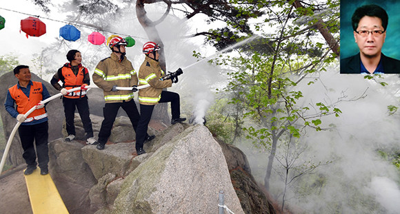 | ▲4월 29일 서울 북한산 중턱에서 열린 산악소방훈련에서 소방관들이 산속에서 방수를 하고 있다. 우측 상단 사진은 고(故) 김정수 주무관. <사진 : 연합뉴스> |