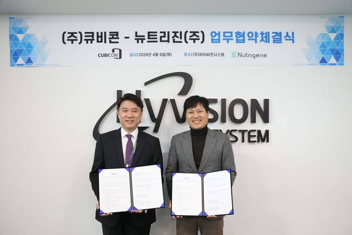 | ▲ 왼쪽부터 최두원 큐비콘 대표와 김종철 뉴트리진 대표가 업무협약 체결 후 기념촬영을 하고 있다. |
