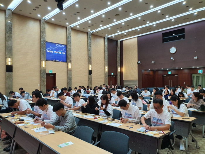 | ▲ 푸르덴셜타워 대회의실에서의 히크만주머니 만들기 봉사활동. |