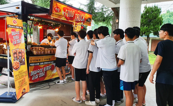 종합식품기업 하림의 찾아가는 무료시식회 하림 푸드트럭이 27일 광주광역시 광주고등학교에 이어 28일 광주동신여자고등학교를 찾아 ‘하림 매실숙성 토종닭 순살 찜닭’을 무료로 제공한다.