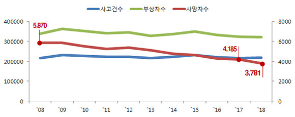 교통사고 사망자 수는 6년 연속 감소세를 유지하며 1976년(3860명) 이후 처음으로 지난해에는 3000명대로 집계됐다. 우리나라 교통사고 사망자는 1991년 최고치인 1만 3429명까지 늘어난 바 있다.