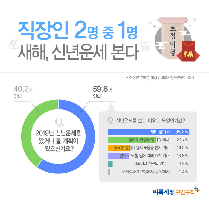 생활밀착형 일자리 정보를 제공하는 벼룩시장구인구직이 직장인 726명을 대상으로 설문 조사한 결과 응답자의 59.8%가 새해를 맞아 ‘신년운세를 봤거나 볼 계획이 있다’고 답했다.