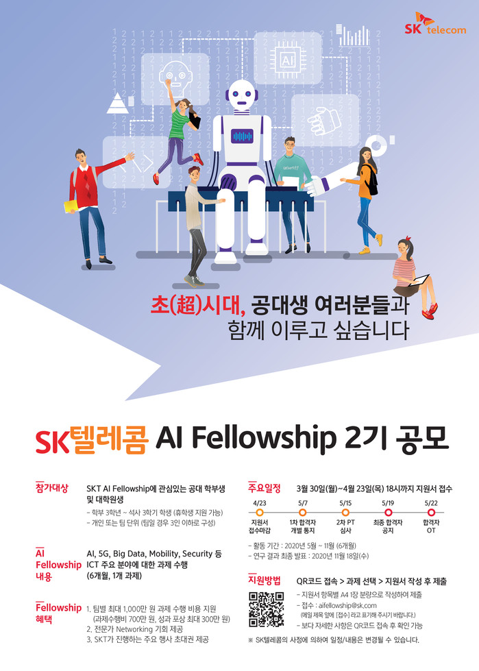 SK텔레콤(대표이사 사장 박정호)은 전국 대학·대학원생들을 대상으로 AI, 5G 등 ICT 주요 분야 실무를 경험해 볼 수 있는 ‘AI Fellowship’ 2기를 선발한다고 밝혔다.