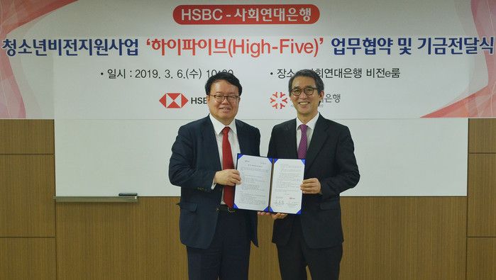 사회연대은행과 HSBC는 아동 양육시설 퇴소(예정) 청소년 자립을 위한 맞춤형 지원 프로그램인 ‘HSBC 청소년 비전 지원사업’을 실시한다. 이와 관련 3월 6일 양 기관은 사회연대은행에서 업무협약 및 기금전달식을 진행했다.