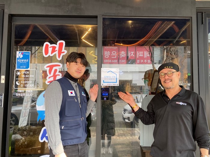 | ▲ 함께하는 사랑밭이 소상공인 착한 기부 ‘함께하는 가게’ 4호점 마포선장 김창만 대표에게 현판을 전달했다. |