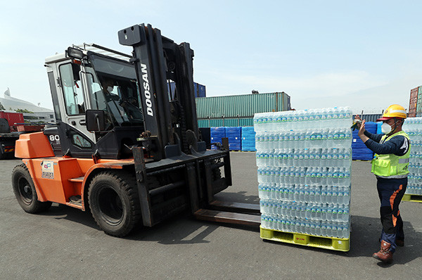 | ▲20일 오전 인천시 중구 항동 인천항에서 인천항 관계자들이 제주도 상하수도본부가 보내온 생수를 하역하고 있다.<사진 : 연합뉴스> |