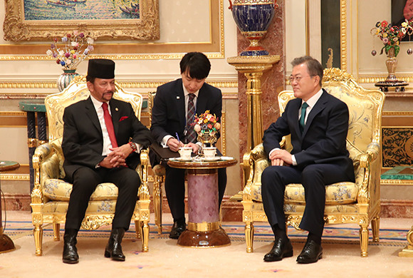 브루나이를 국빈방문 중인 문재인 대통령은 11일(현지시간) 하싸날 볼키아 브루나이 국왕과 브루나이 왕궁에서 정상회담을 갖고 양국 관계 발전방향 및 한·아세안 협력강화, 한반도 정세 등에 대해 심도있게 논의한 후 24개항으로 이뤄진 공동성명을 채택했다.