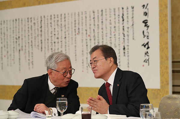 | ▲ 문재인 대통령이 13일 청와대에서 3·1운동 및 대한민국 임시정부 수립 100주년 기념사업추진위 위원들과 오찬에서 한완상 위원장과 대화하고 있다. <사진 : 연합뉴스> |