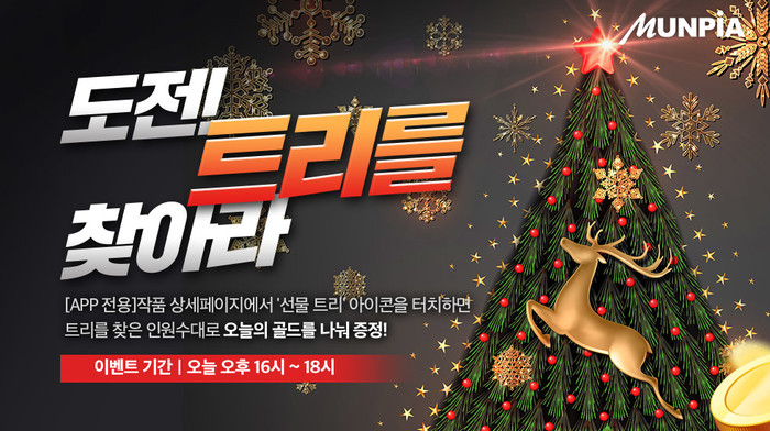 25일부터 3일간 진행되는 ‘도전! 트리를 찾아라’ 이벤트는 매일 18시~20시 총 3회에 걸쳐 진행되며 트리를 찾은 회원들에게 총 600만 골드를 나누어 지급할 예정이다. 이 이벤트는 문피아 앱을 통해서만 참여할 수 있다.