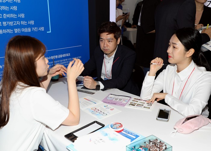 | ▲ 2019 금융권 공동 채용박람회에서 수협은행 취업을 준비하는 예비금융인들이 채용상담을 진행하고 있다. |