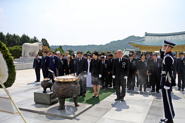 | ▲지난해 국립대전현충원에서 열린 현충일 추념식에서 문재인 대통령 내외와 주요내빈들이 현충탑에 헌화 및 분향을 하고 있다. |