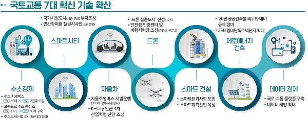 4차 산업혁명 시대가 ‘선도형 경제’로 나아갈 기회라는 인식 하에 ▲수소경제 ▲스마트시티 ▲드론 ▲자율차 ▲스마트건설 ▲제로에너지건축(ZEB) ▲데이터경제 등 새로운 미래가치를 창출할 ‘7대 혁신기술’을 중점 확산·구현한다.
