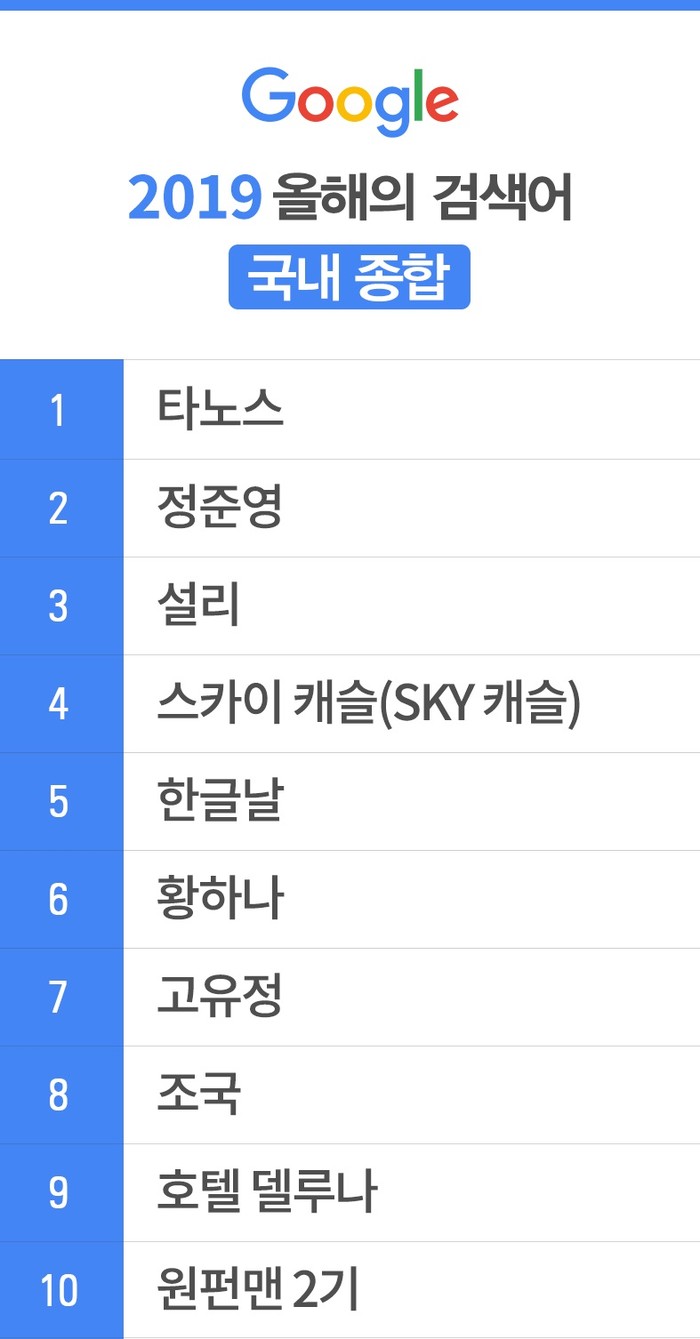 2019년 국내 인기 검색어 종합 순위는 △타노스 △정준영 △설리 △스카이캐슬(SKY 캐슬) △한글날 △황하나 △고유정 △조국 △호텔 델루나 △원펀맨 2기 순으로 나타났다.