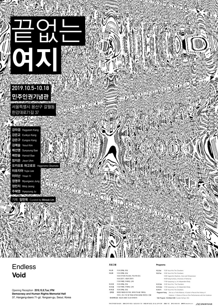 민주화운동기념사업회(이사장 지선)는 민주인권기념관(옛 남영동 대공분실)에서 임민욱 기획 ‘끝없는 여지(Endless Void)’ 展을 10월 5일(토)부터 18일(금)까지 개최한다고 밝혔다.