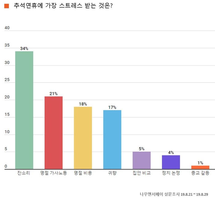 ‘추석연휴에 가장 스트레스 받는 것’으로 ‘잔소리(34%)’가 가장 많은 응답을 차지하였고 그 뒤를 이어 ‘명절가사노동(21%)’, ‘명절비용(18%)’, ‘귀향(17%)’, ‘집안 비교(5%)’, ‘정치논쟁(4%)’, ‘종교갈등(1%)’ 등으로 나타났다.