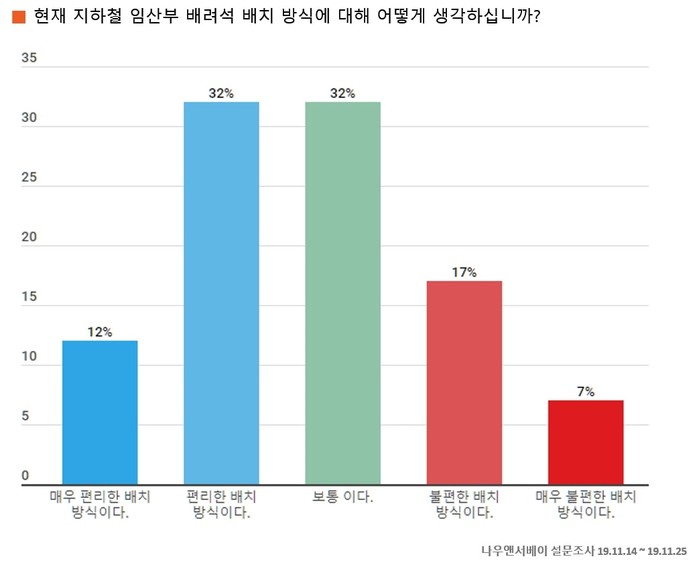 ‘귀하는 임산부가 아닌 사람이 배려석에 앉았다고 언쟁을 했거나 다른 사람들이 언쟁하는 것을 목격한 적이 있으신가요?’에 대하여 질문에 ‘아니오(61%)’, ‘예(39%)’ 순으로 응답해, 임산부 배려석에 대한 자리 다툼이 적지 않은 것으로 나타났다.