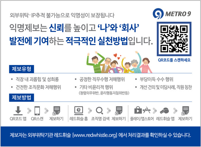 서울시메트로9호선은 익명 제보시스템의 활성화를 위해 사은품과 클린스티커를 제공해 내·외부 제보를 독려하고 이를 통해 구성원들이 보다 더 투명한 조직문화를 만들어 갈 수 있을 것이라고 밝혔다.