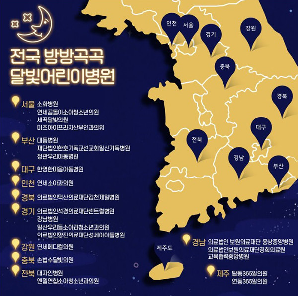 현재 운영되는 달빛어린이병원은 전국 22곳으로 보건복지부는 소아진료기관의 적극적인 참여를 독려하고 있다.
