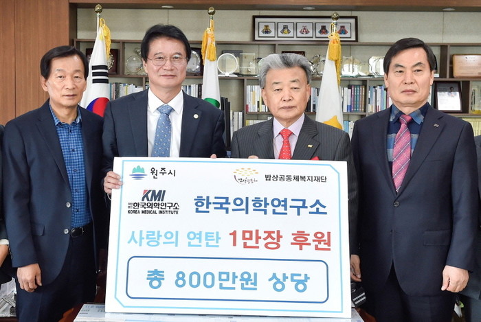 KMI한국의학연구소(이하 KMI) 사회공헌사업단은 8일 강원도 원주시청을 찾아 800만원 상당의 사랑의 연탄 1만장을 기탁했다.