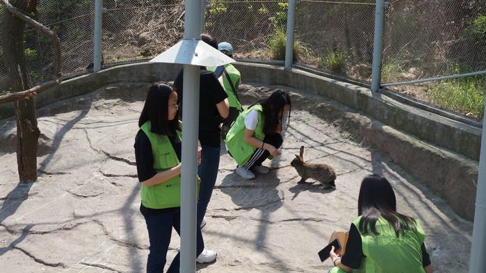 | ▲학생들이 동물원에서 토끼에게 먹이를 주며 즐거워하고 있다. |
