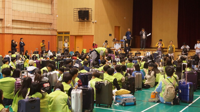 | ▲학생들이 출발에 앞서 무학중학교 강당에 모여 안전사고 및 성폭력 예방교육을 받고 있다. |