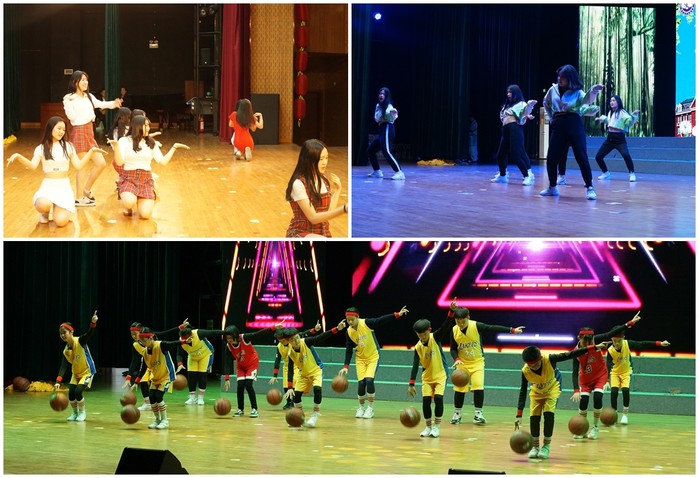 | ▲둘째날 저녁에는 한중 학생들의 문화교류가 펼쳐졌다. (사진 좌측 위쪽부터 시계방향으로 무학중학교, 무학여자고등학교, 중국연태애화쌍어국제학교의 공연모습) |